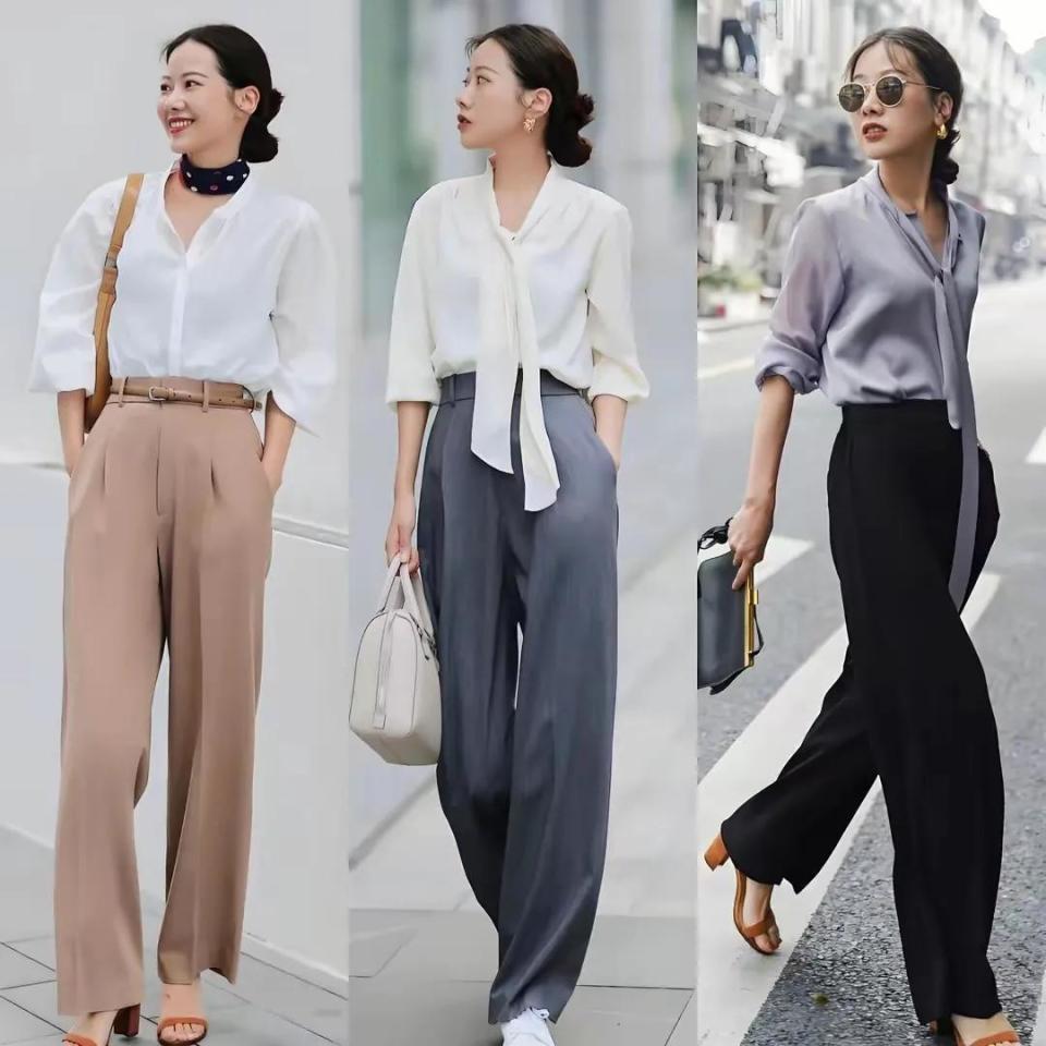 当然,有的场合并不适合选择吊带上衣来穿搭,而是要一些比较正式感的穿衣风格,但是咱们也没有必要穿的厚衣板板正正,我们可以像下面这3套穿衣打扮一样,用小众设计的衬衫上衣雪纺上衣,搭配上经典耐看的大地色西裤或者是灰色西裤,这样的穿衣配色就不会过于正式感。