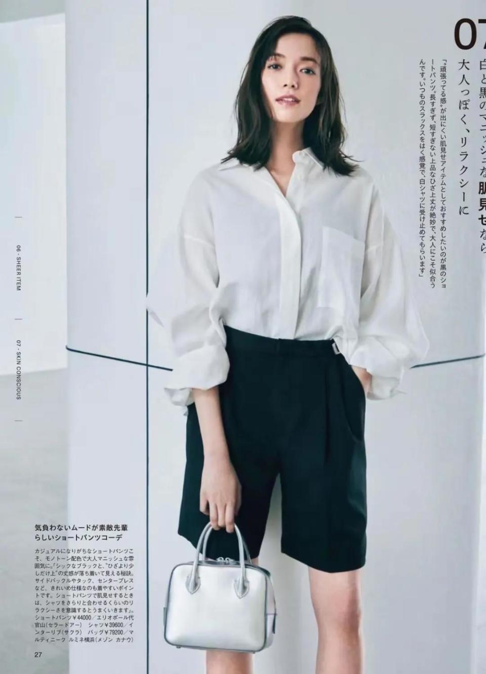 有的时候选择的衣服越是简约款,反而越容易穿出高级感,也就是常说的“减法”搭配技巧,下面这位博主用一件挺括有型的白色衬衫短袖上衣,搭配黑色西装面料的百慕大短裤,轻松摆脱路人感,穿出高级感。