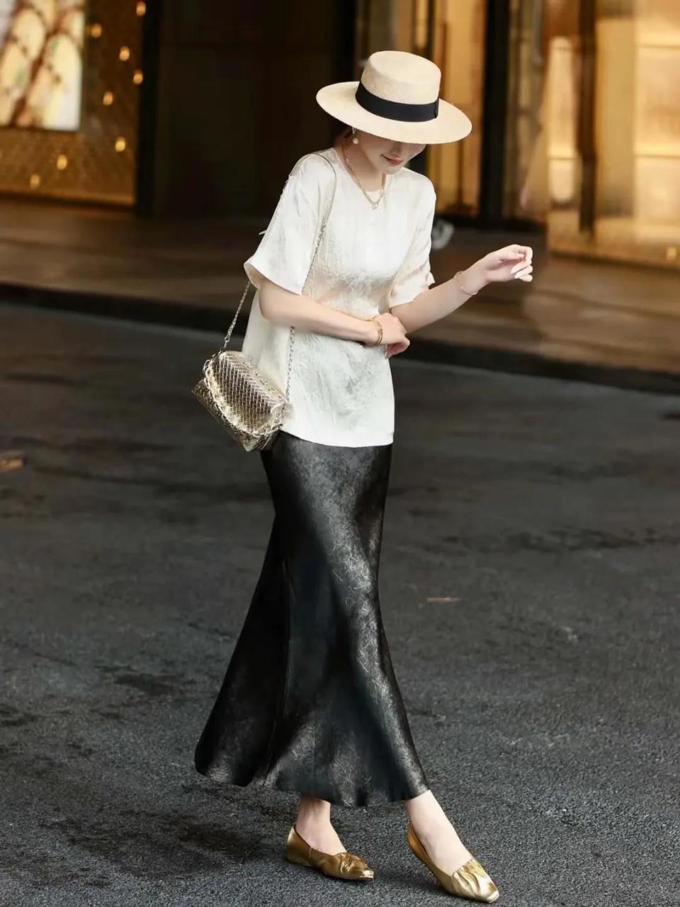 有的时候想要自己的穿衣打扮变得更加有品位,不光要选对上衣,还要选对下半身的裙子或者是长裤,甚至是配饰,例如下面这位达人用的是缎绸面料的上衣,搭配的也是同样材质的半身裙,头上戴了一款草帽,还有珍珠耳环和一款精致的项链,瞬间让整套穿衣打扮变得更加的有氛围感,而且很显贵。