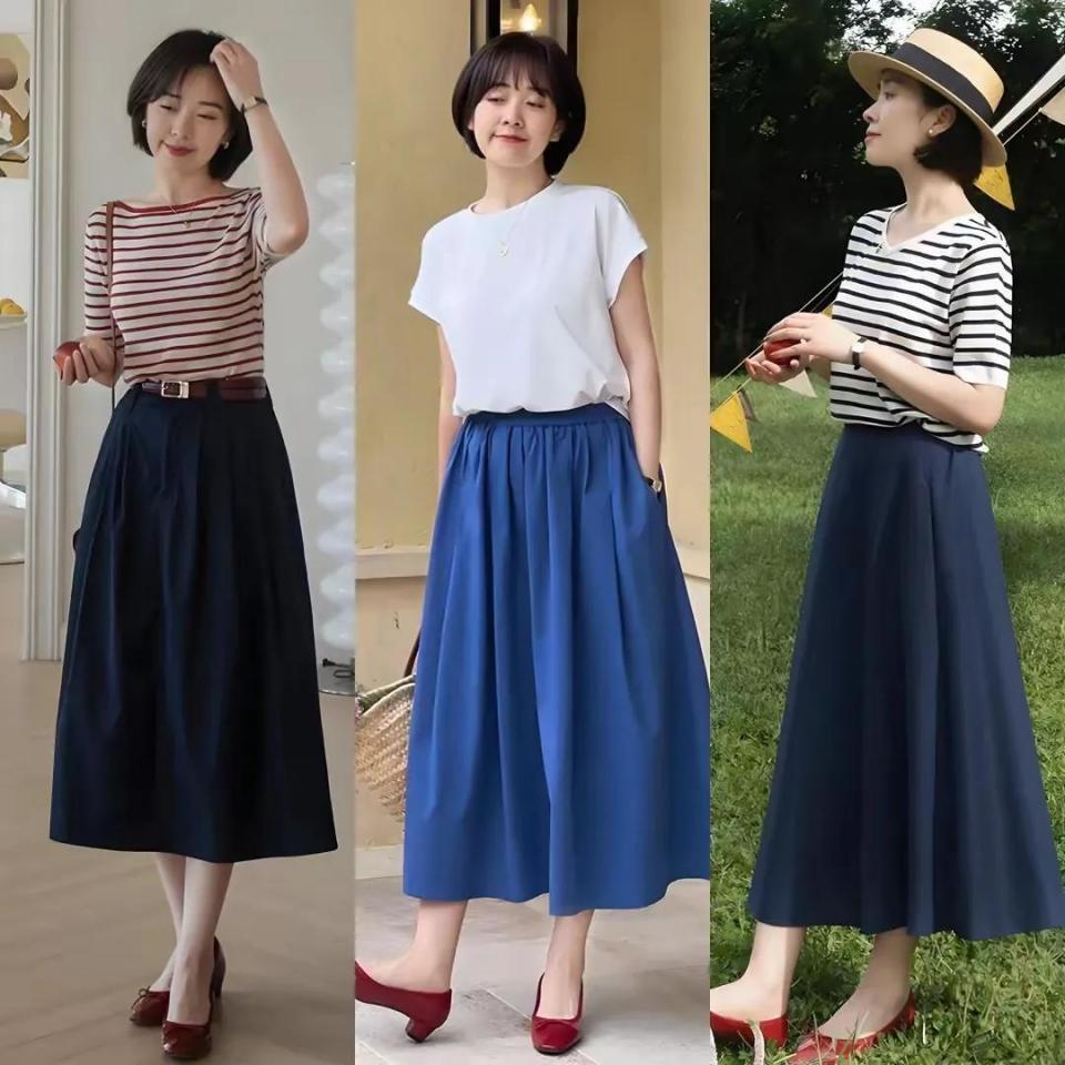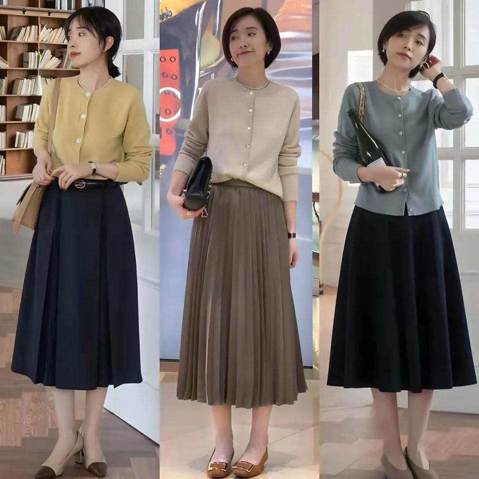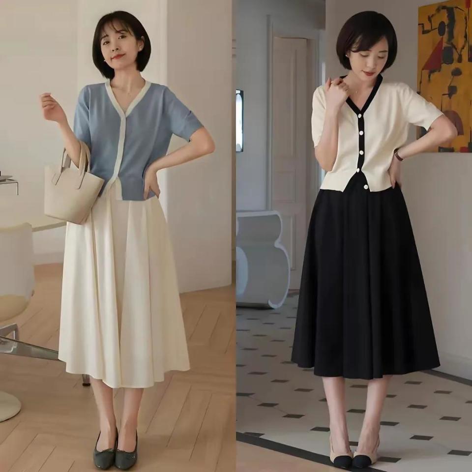 小个子女生在这个夏季还蛮推荐大家选择针织开衫来搭配的,只要用透气性好,面料稍微单薄一点的款式来穿搭,其实一点也不闷热,例如下面用雾霾蓝的针织开衫和白色的针织开衫来搭配上高腰逍遥环的伞状半身裙,穿出来的校花显高显瘦,而且温柔大气。