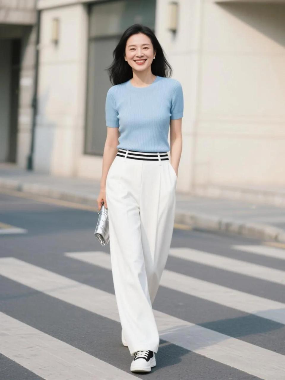 我们还可以选择浅色系的上衣来搭配,下面这一件浅蓝色的针织短袖上衣,颜色修饰肤色,中年女性穿了也显白鲜嫩,让你看起来更加有精气神。