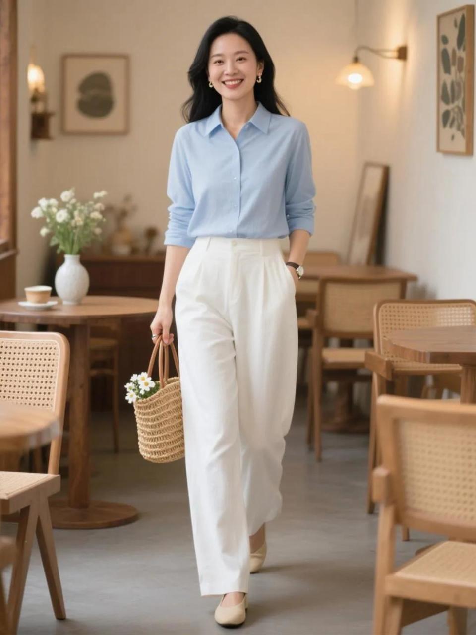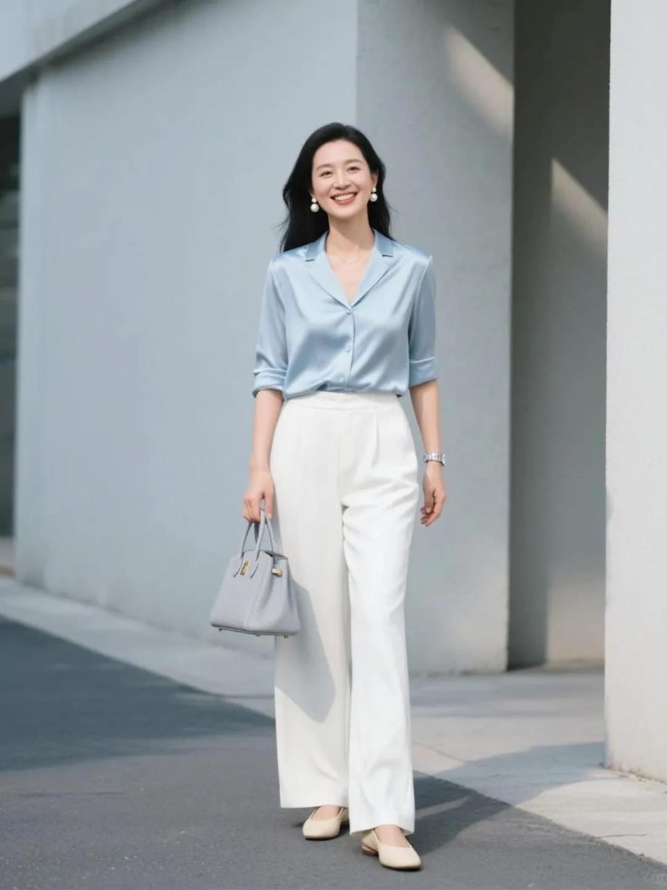 当你把浅蓝色衬衫的衣服面料换成免烫型,或者是真丝面料的衬衫,再搭配上白色的直筒阔腿裤,和杏色的羊皮材质浅口单鞋,使得穿搭者变得更加高贵典雅,很显贵的一身穿衣打扮。