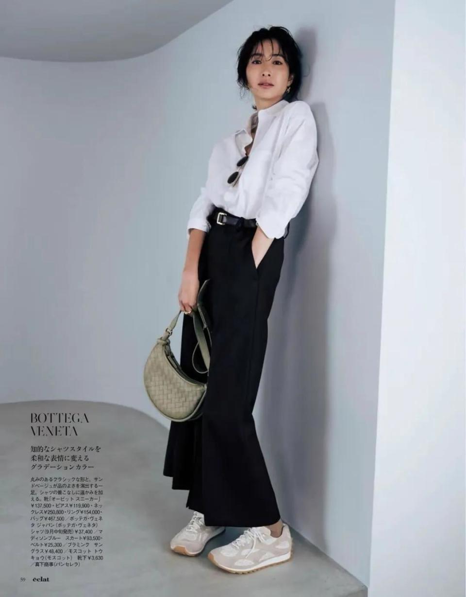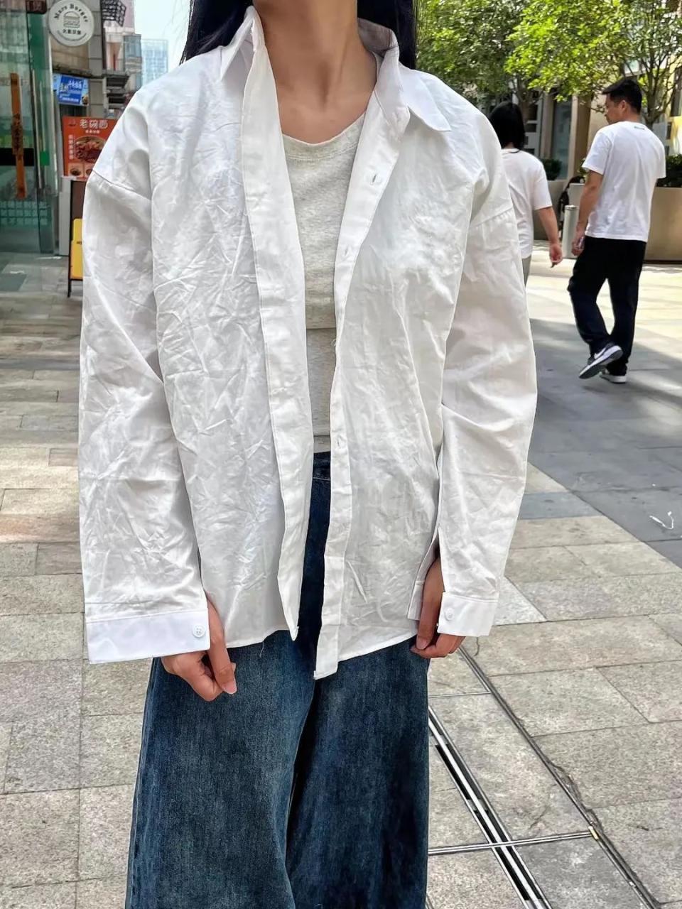 当然了,就算是白色衬衫搭配上黑色的西裤也是可以穿出休闲感的,最主要的还是看咱们是如何搭配,例如下面这位素人博主,用一件微宽松的白色立领衬衫搭配上黑色的直筒裤,脚上穿了一双休闲运动鞋,穿出来的效果就很时尚而且休闲感满满。
