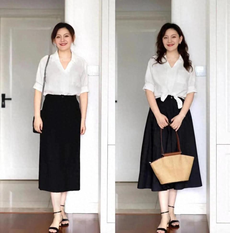 雨季绵绵,在这炎热的夏天,确实凉爽起来,只不过出门时需要带把雨伞才行,不管什么天气,外出都要把自己打扮得漂漂亮亮的,比如下面这位博主选择一件白色衬衫搭配黑色半身裙,脚上穿着一双黑色高跟凉鞋,展现出来的效果,经典时尚炒股配资首选,照着穿就很漂亮。