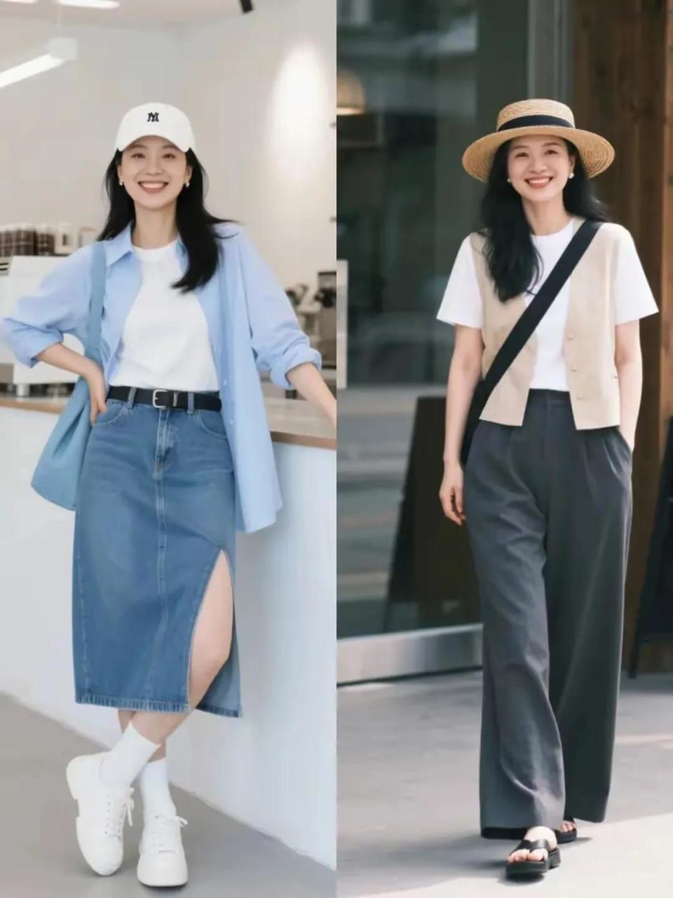 衬衫也是可以穿出优雅的女人味,而且还能变得休闲洋气,例如浅蓝色衬衫,内搭白色T恤和蓝色的牛仔直筒半身裙组合,头上再加上一款棒球帽,脚上穿了一双白色的运动鞋,这样的穿衣风格,奔三奔四的女性穿了都显得年轻有活力。