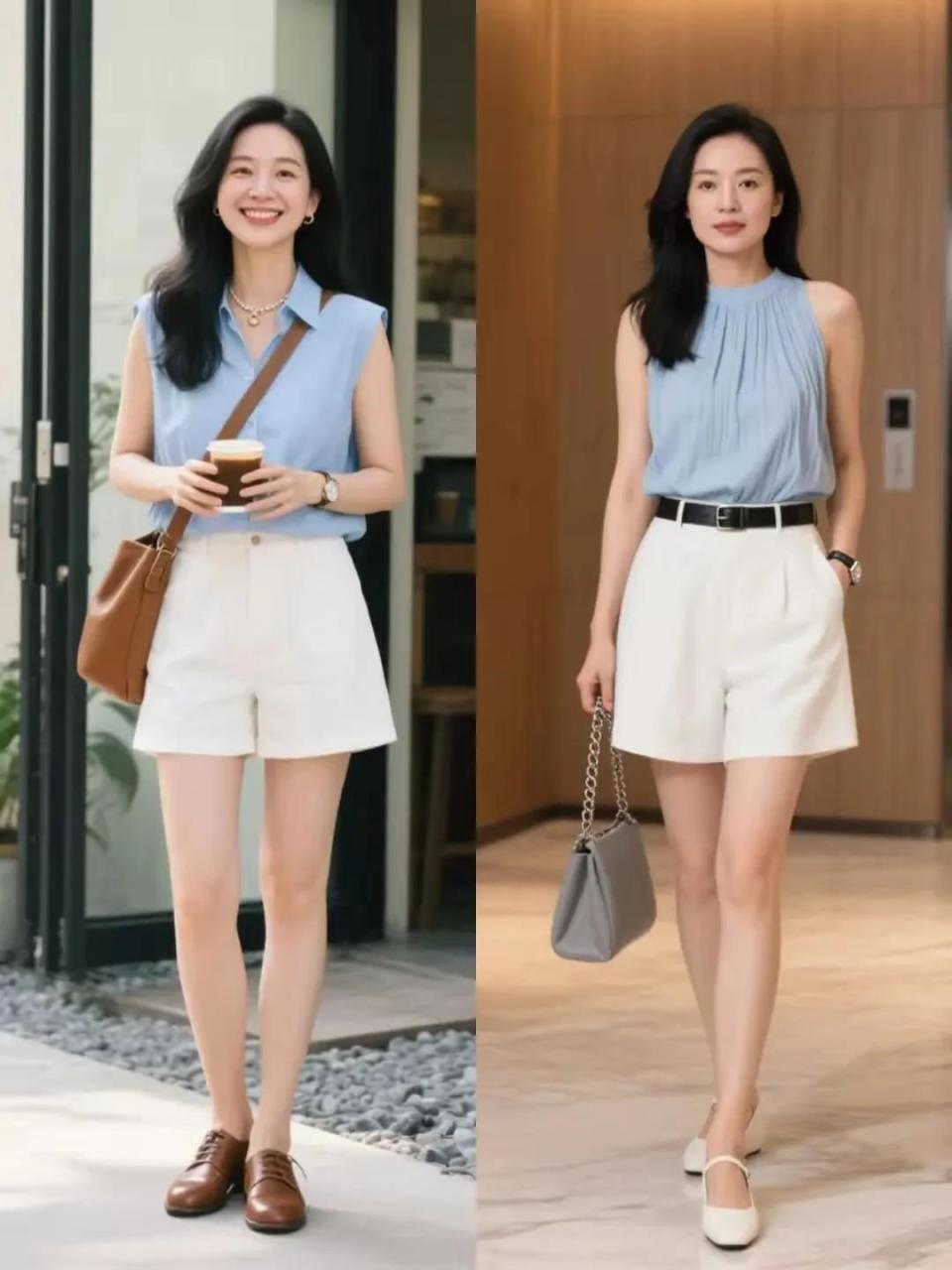 当然了,炎热的夏季,如果能有条件穿的清爽风格,一定要大胆地去尝试,浅蓝色的无袖衬衫上衣搭配白色百慕大短裤,脚上穿一双白色玛丽珍鞋和大地色皮鞋,这样的穿衣打扮通勤时髦,穿搭去上班、逛街、约会都没有任何问题。