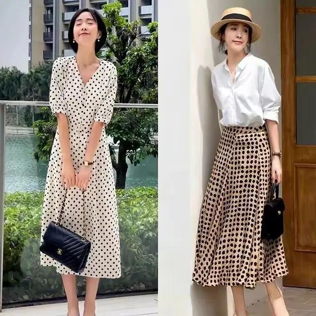 我们还可以选择波点的连衣裙,或者是半身裙来搭配,波点的裙子也是女性一直所喜爱的裙装之一,例如,下面这一条,黑白波点的高腰收腰款连衣裙,穿在身上之后简单耐看。也可以选择哦,白色的衬衫上衣搭配上波点的半身裙,繁简结合的穿搭更有层次感。