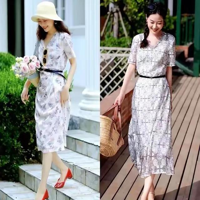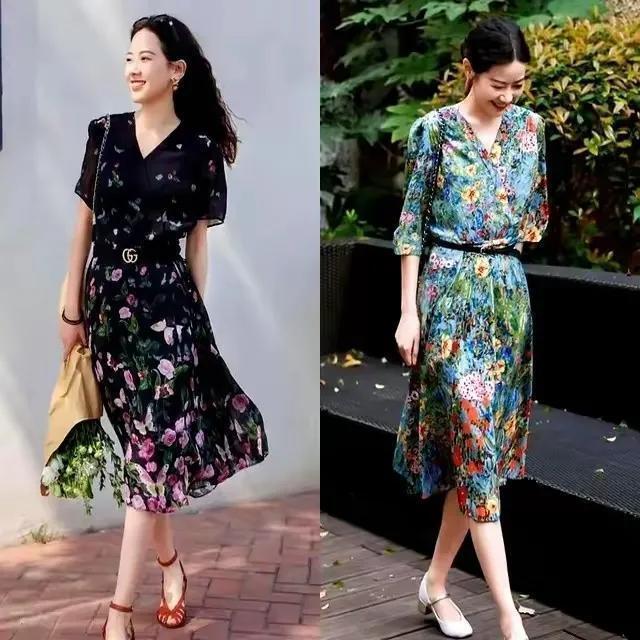 不过就算是选择印花的衣服色彩也不能过于花哨,太花哨的情况下也很容易出错,咱们还可以选择浅色系的连衣裙,例如下面这两条印花连衣裙穿搭就很不错,穿在身上之后仙气飘飘。