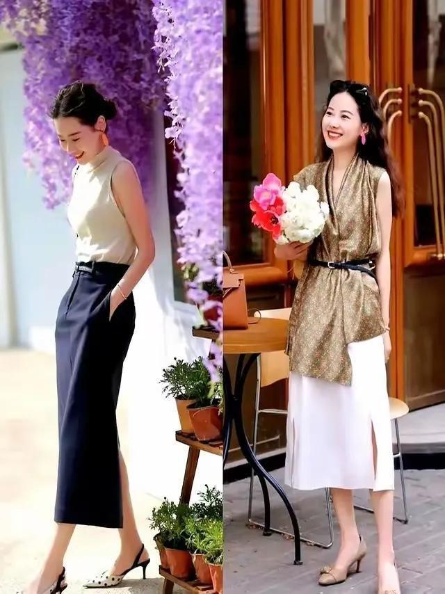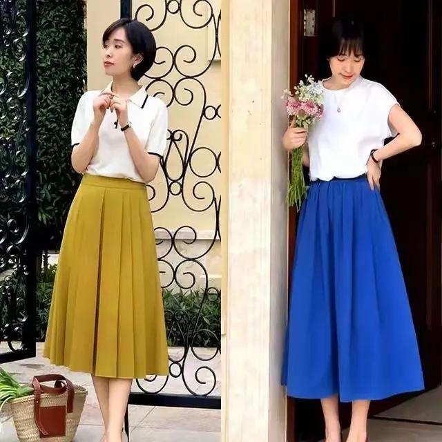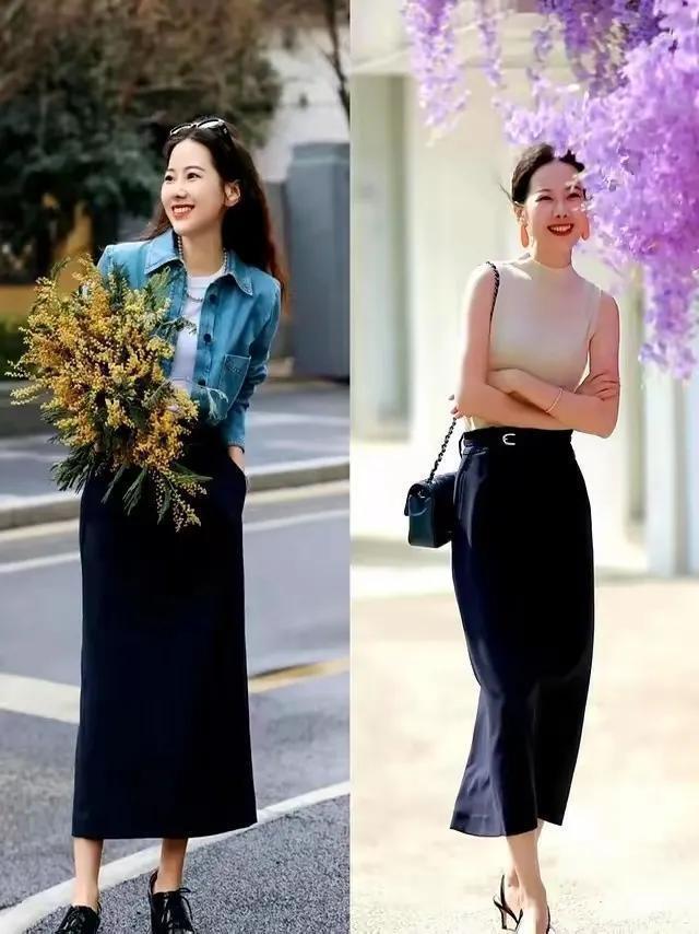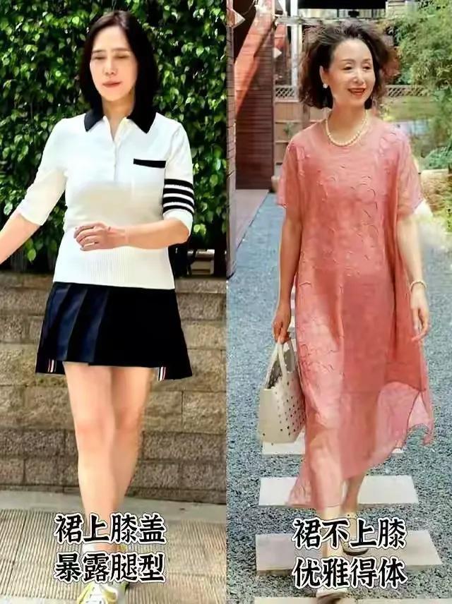 所以说我们想要把裙子穿出高贵感,需要从多个方面入手才行,比如中年女性就不太适合穿短裙,像下面左边的这一条短裙,有装嫩的嫌疑,而且穿在身上还容易暴露大腿粗等问题,我们选择的裙子应该盖过膝盖到小腿肚的位置,或者是露出脚踝就行,这样的裙子穿在身上才会更加的优雅得体。