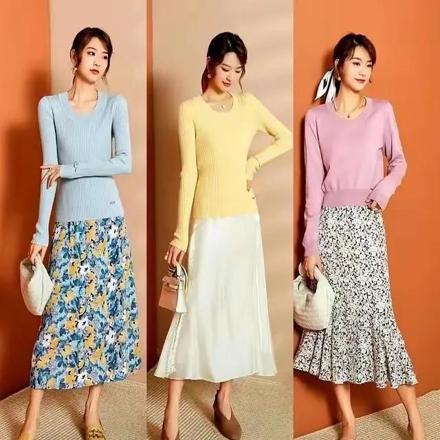 咱们还可以选择低饱和度的衣服来组合搭配,例如下面浅蓝色,浅黄色,浅紫色,的针织上衣搭配上印花的半身裙,脚上穿着一双浅口的单鞋,轻轻松松穿出一种轻熟的御姐范,特别的迷人。